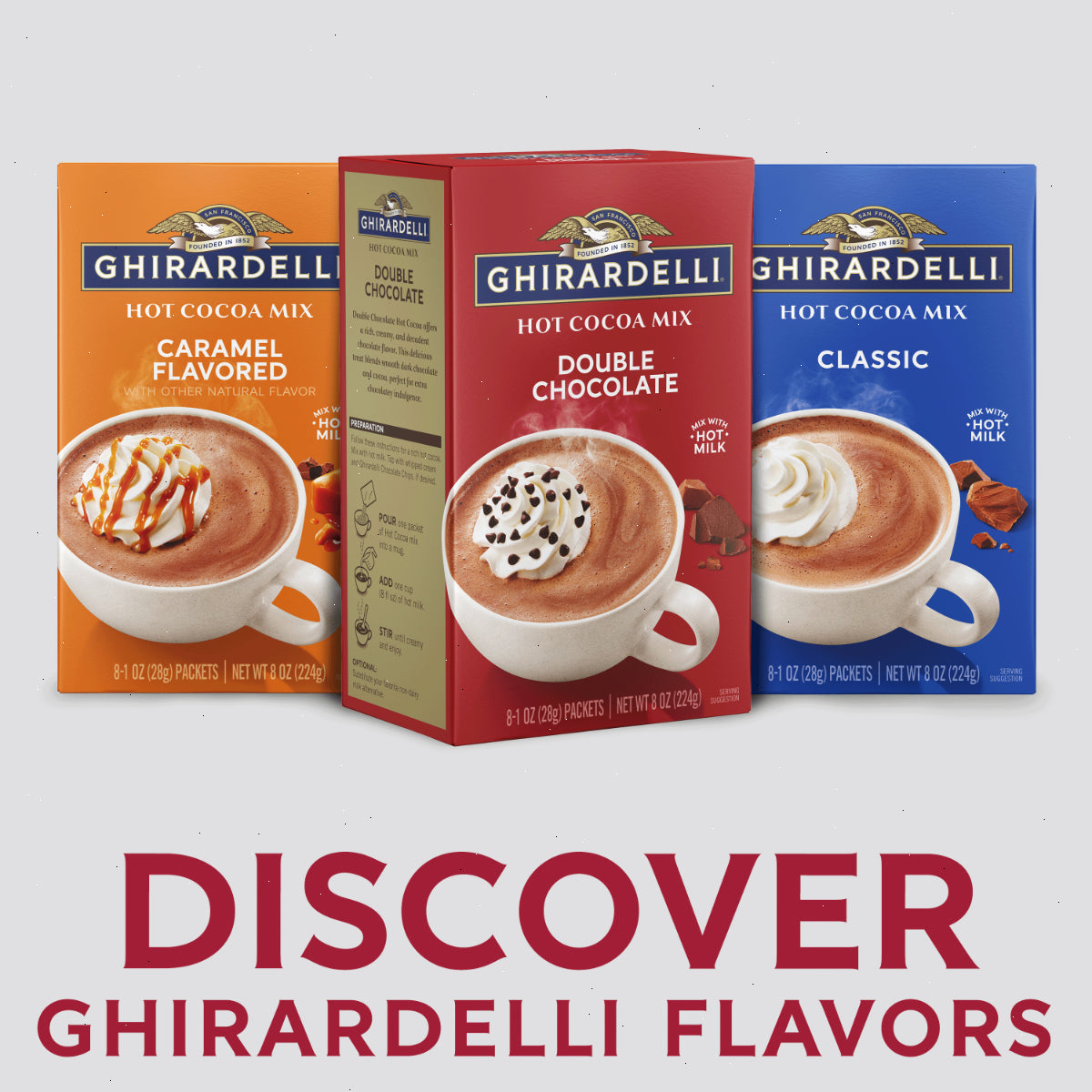 Enjoy GHIRARDELLI Double Chocolate Hot Cocoa Mix, a delightful treat for cocoa lovers. This mix offers a rich, creamy, and decadent chocolate flavor, blending smooth dark chocolate and cocoa for extra chocolatey indulgence. Perfect for cozying up with a warm mug any time of the year, it's an ideal way to elevate your daily routine. Use this mix to create indulgent hot cocoa or enhance your favorite desserts. GHIRARDELLI products are crafted with premium ingredients. GHIRARDELLI Makes Life A Bite Better.
