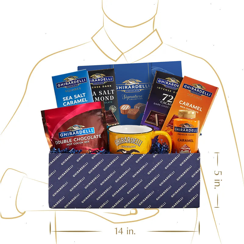 Celebrate any special occasion with the Ghirardelli Celebrations Chocolate Gift Box. Featuring a selection of our best-selling chocolate bars, plus firm favorites like our Double Chocolate Hot Cocoa Mix, this gift box has something for everyone. Whether you’re celebrating a key milestone like a birthday or anniversary, or looking for the perfect gift to give during the holidays, make each occasion even sweeter with a Ghirardelli gift box. Dimensions: 14” x 13” x 5" This Ghirardelli Celebrations Chocolate Gift Box includes: