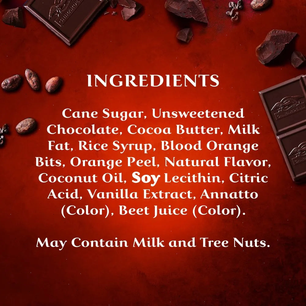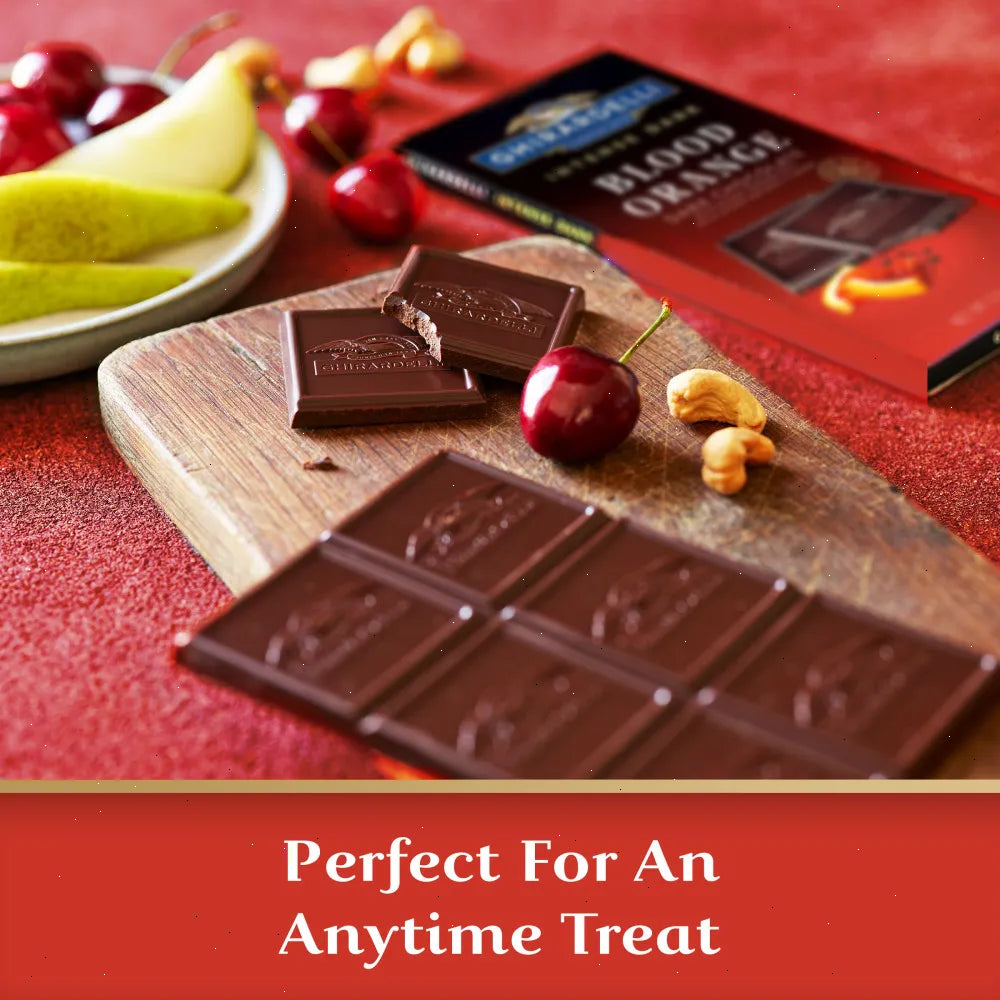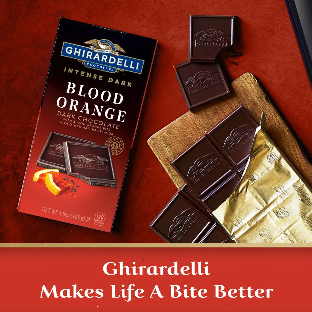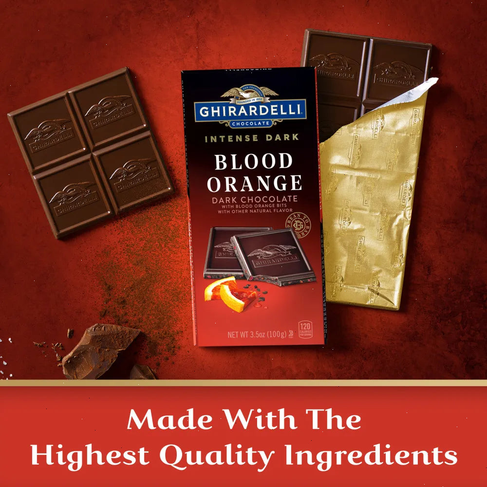 Sweet and tangy, GHIRARDELLI Intense Dark Blood Orange Chocolate is the perfect way to indulge your senses. Each bar contains a blend of zesty blood orange bits and blood orange flavor, balanced with intense dark chocolate. Each case comes with twelve (12) bars and are perfect for portioning for your charcuterie board or for gifting. Experience the ultimate indulgence with the GHIRARDELLI Intense Dark Blood Orange Chocolate Bar!
