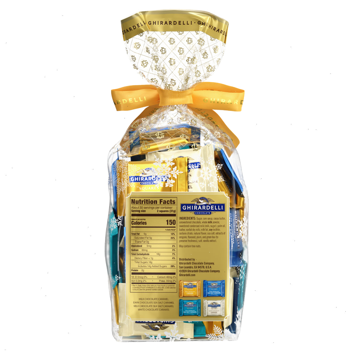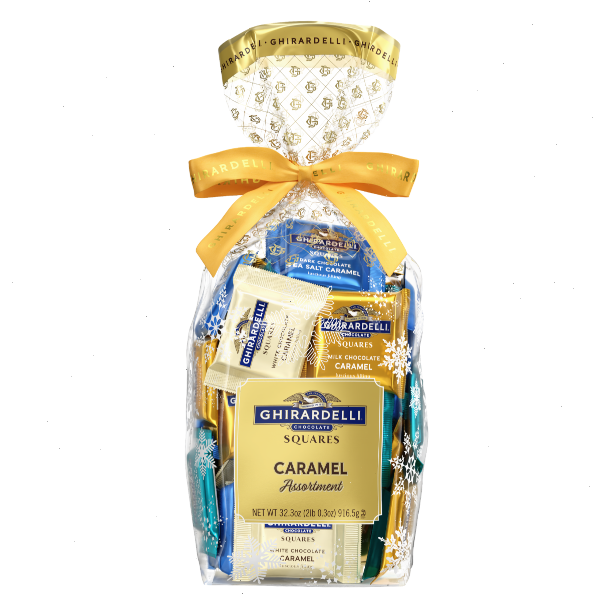 Celebrate the holiday season with the Ghirardelli Snowflake Assorted Chocolate Squares Gift Bag. This 2lb bag contains an assortment of our best selling caramel flavors including milk chocolate caramel, white chocolate caramel, dark chocolate caramel, and milk chocolate sea salt caramel.